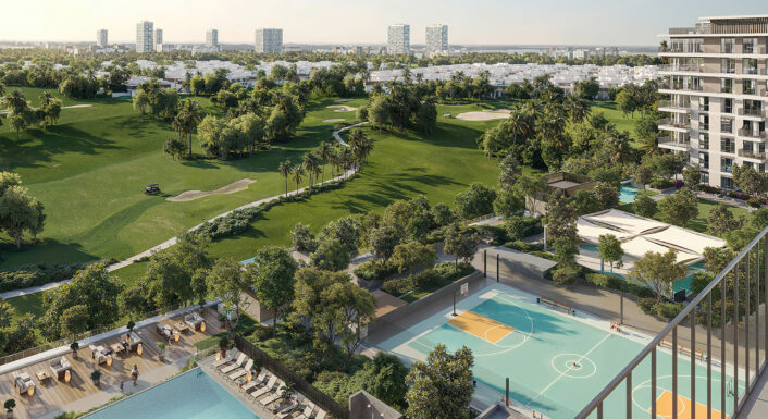 Golf Views: A modern apartment complex offering sleek interiors and expansive vistas.
