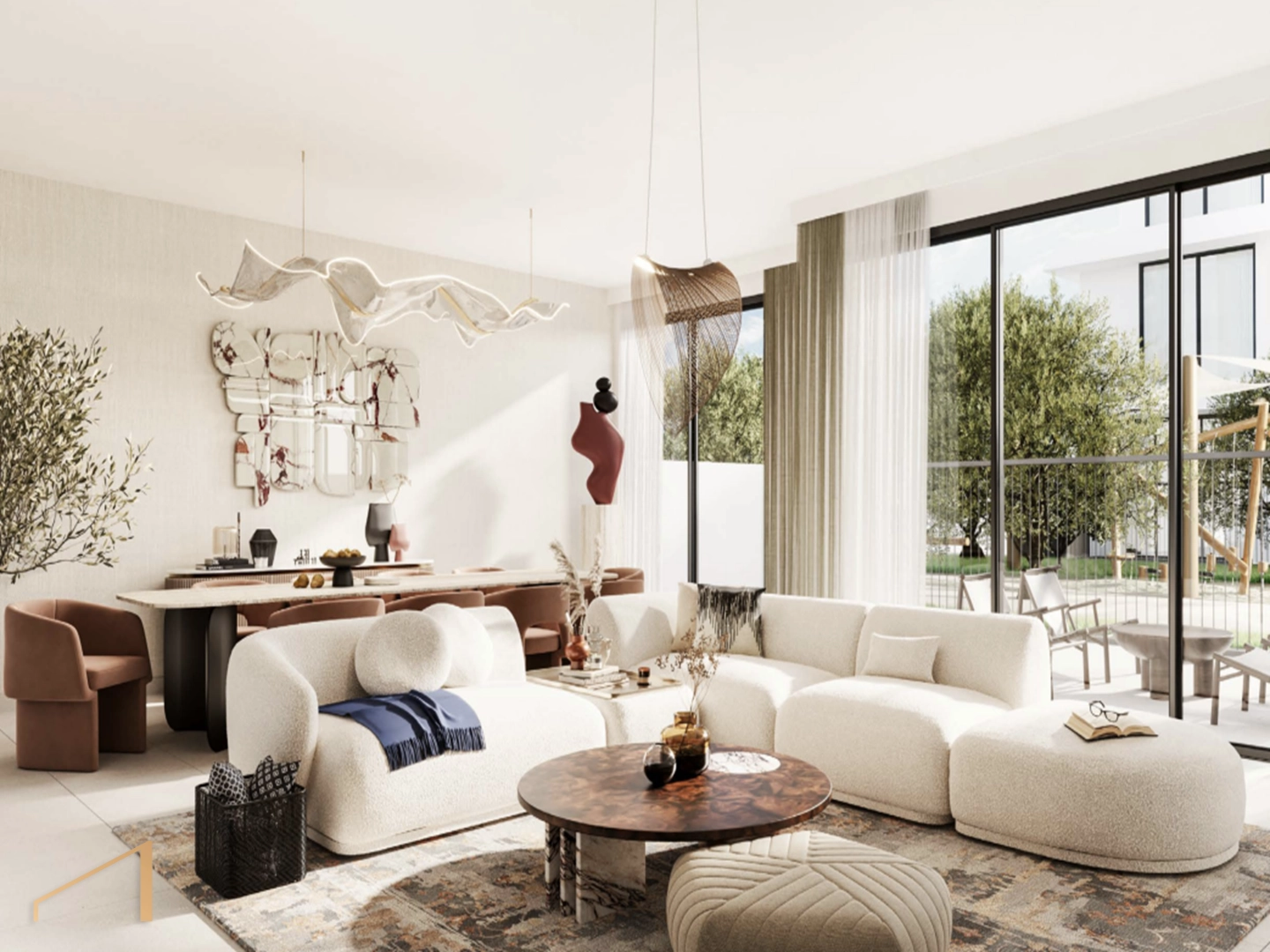 - Open-plan living and dining areas