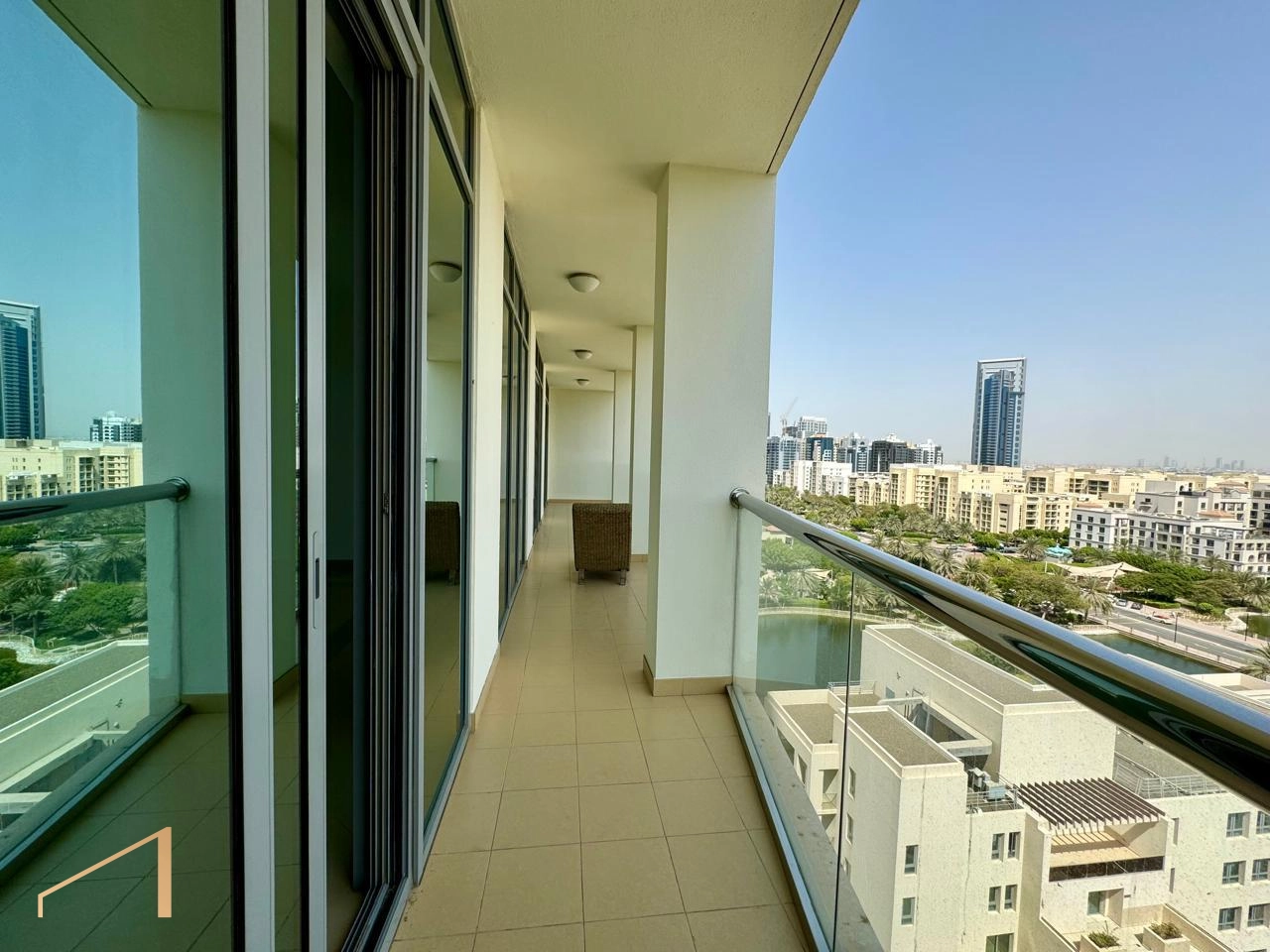 Spacious terrace overlooking the Emirates Golf Course and pool